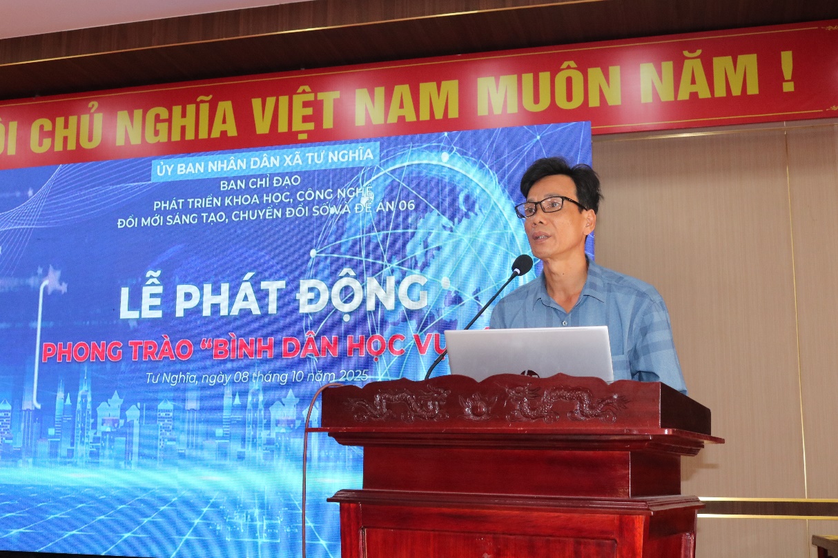 Sáng ngày 08/10/2025, Ban Chỉ đạo phát triển khoa học, công nghệ, đổi mới sáng tạo, chuyển đổi số và Đề án 06 xã Tư Nghĩa tổ chức Lễ phát động phong trào “ Bình dân học vụ số”, nhằm chào mừng ngày chuyển đổi số Quốc gia (10/10) và Tuần lễ hưởng ứng học tập suốt đời năm 2025.