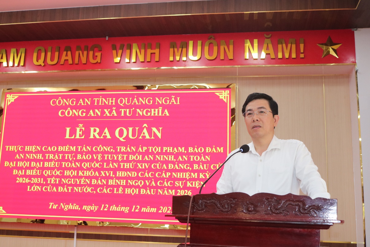 Tại Lễ ra quân, đồng chí Thượng tá Trần Định - Ủy viên Ban Thường vụ Đảng ủy, Trưởng Công an xã thông qua Mệnh lệnh của Giám đốc Công an tỉnh Quảng Ngãi về ra quân thực hiện đợt cao điểm tấn công, trấn áp tội phạm, bảo đảm an ninh, trật tự, bảo vệ tuyệt đối an ninh, an toàn Đại hội đại biểu toàn quốc lần thứ XIV của Đảng, bầu cử đại biểu Quốc hội khóa XVI, HĐND các cấp nhiệm kỳ 2026 - 2031, tết Nguyên đán Bính Ngọ và các sự kiện lớn của đất nước, các lễ hội đầu năm 2026.