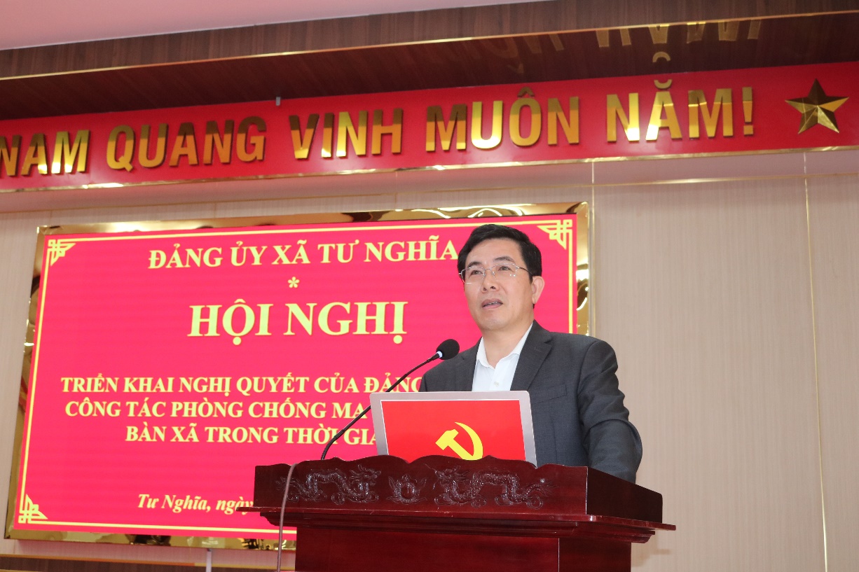 Phát biểu khai mạc tại hội nghị, đồng chí Nguyễn Đăng Vinh - Bí thư Đảng ủy, Chủ tịch HĐND xã nhấn mạnh: Công tác phòng, chống ma túy và xây dựng xã không có ma túy là nhiệm vụ quan trọng, cần sự vào cuộc quyết liệt của cả hệ thống chính trị và sự đồng thuận của Nhân dân trên địa bàn xã. Vì vậy, các ban, ngành, đoàn thể, từng thôn, Trường học phải đồng bộ triển khai, tăng cường công tác tuyên truyền, phối hợp chặt chẽ trong quản lý, giám sát và hỗ trợ người dân, quyết tâm hoàn thành mục tiêu xây dựng xã Tư Nghĩa không ma túy giai đoạn 2025 - 2030, góp phần xây dựng cộng đồng an toàn, lành mạnh, văn minh, đảm bảo trật tự, an toàn xã hội và phát triển bền vững.