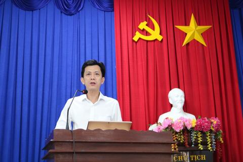 Đồng chí Nguyễn Ngọc Hưng - Phó Bí thư Đảng ủy, Chủ tịch UBND xã, Chủ tịch Hội đồng Nghĩa vụ Quân sự xã Tư Nghĩa phát biểu tại hội nghị