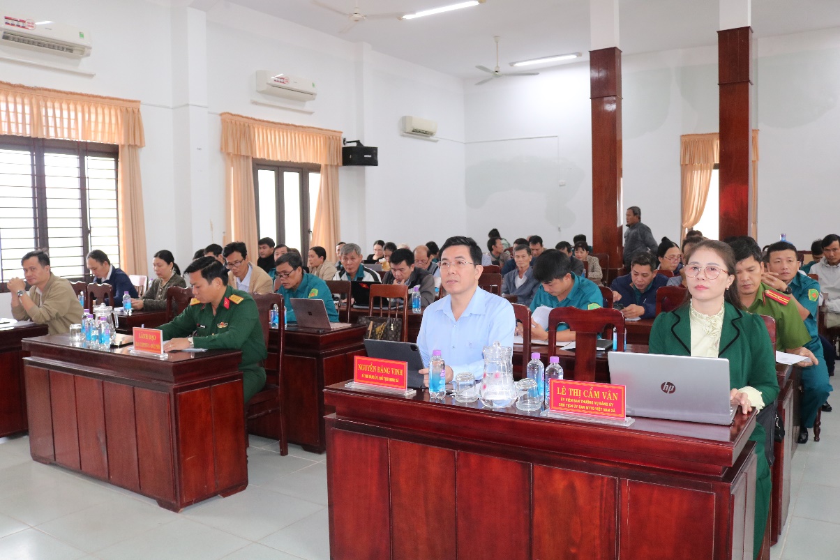 Về dự hội nghị có các đồng chí: Thượng tá Kiều Duy Bình - Phó chỉ huy trưởng Ban chỉ huy phòng thủ khu vực V Đức Phổ; Nguyễn Đăng Vinh - Bí thư Đảng ủy, Chủ tịch HĐND xã; Lê Thị Cẩm Vân - Ủy viên Ban Thường vụ Đảng ủy, Chủ tịch Ủy ban MTTQVN xã; Huỳnh Ngọc Thuận - Ủy viên Ban Thường vụ Đảng ủy, Phó Chủ tịch HĐND xã; thành viên Hội đồng Nghĩa vụ Quân sự xã; Bí thư chi bộ, Trưởng thôn, Thôn đội trưởng ở 25 thôn trên địa bàn xã.