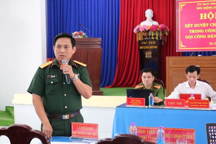 Phó Chủ tịch Hội đồng Nghĩa vụ quân sự xã phát biểu tại buổi xét duyệt chính trị, chính sách