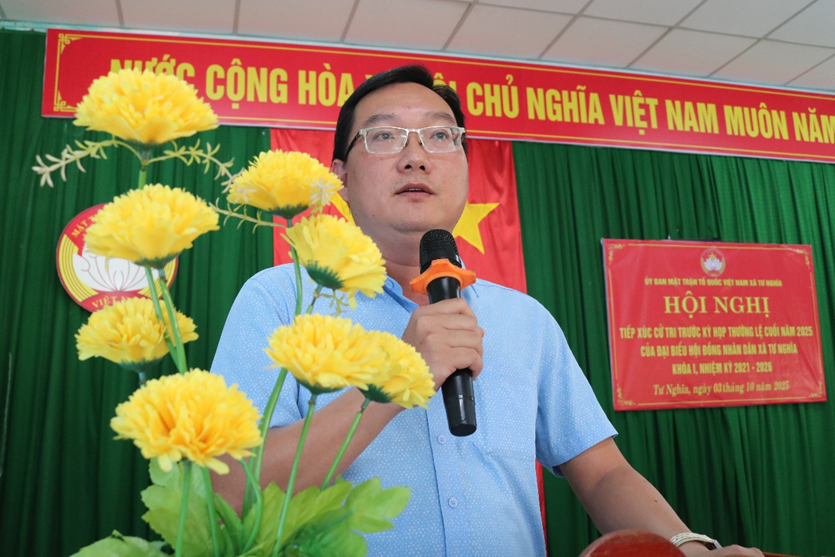 Để chuẩn bị cho kỳ họp thường lệ cuối năm 2025 của đại biểu HĐND xã Tư Nghĩa khóa I, nhiệm kỳ 2021 - 2026, từ ngày 01/10 đến ngày 08/10/2025, các Tổ đại biểu HĐND xã Tư Nghĩa đã phối hợp với Thường trực HĐND, Ủy ban MTTQVN xã tổ chức tiếp xúc cử tri tại 10 điểm liên thôn trên địa bàn xã.