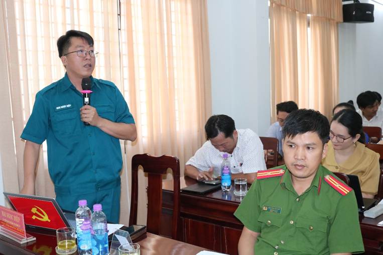 Đồng chí Mai Ngọc Điệp - Ủy viên BTV Đảng ủy, Chỉ huy Trưởng Ban Chỉ huy Quân sự xã trả lời các ý kiến tại hội nghị