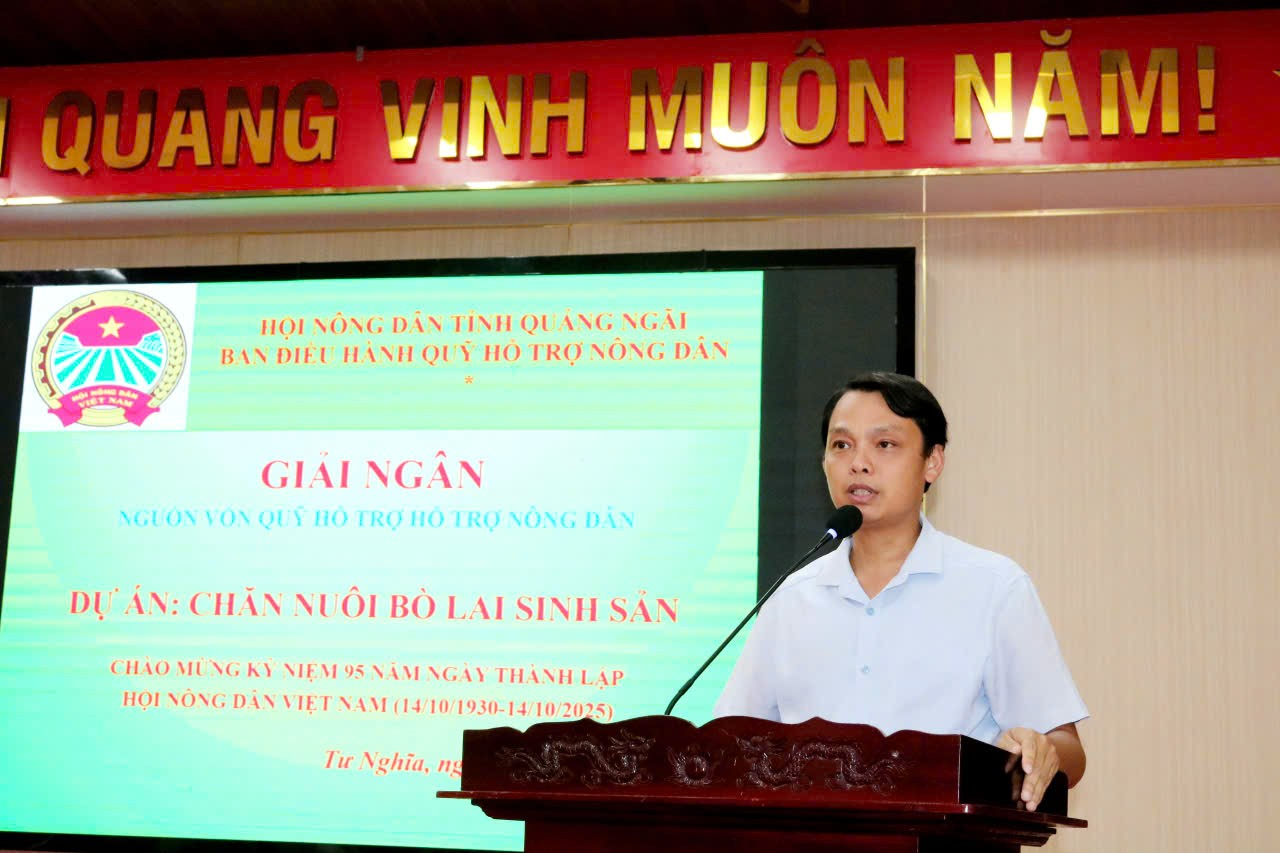 Chiều 13/10/2025, Hội nông dân tỉnh Quảng Ngãi phối hợp với Hội nông dân xã Tư Nghĩa tổ chức giải ngân 500 triệu đồng từ nguồn vốn Quỹ Hỗ trợ nông dân tỉnh cho các hội viên vay thực hiện Dự án “Chăn nuôi bò lai sinh sản” trên địa bàn xã. Đây là sự kiện nhằm chào mừng kỷ niệm 95 năm ngày thành lập Hội Nông dân Việt Nam (14/10/1930- 14/10/2025).
