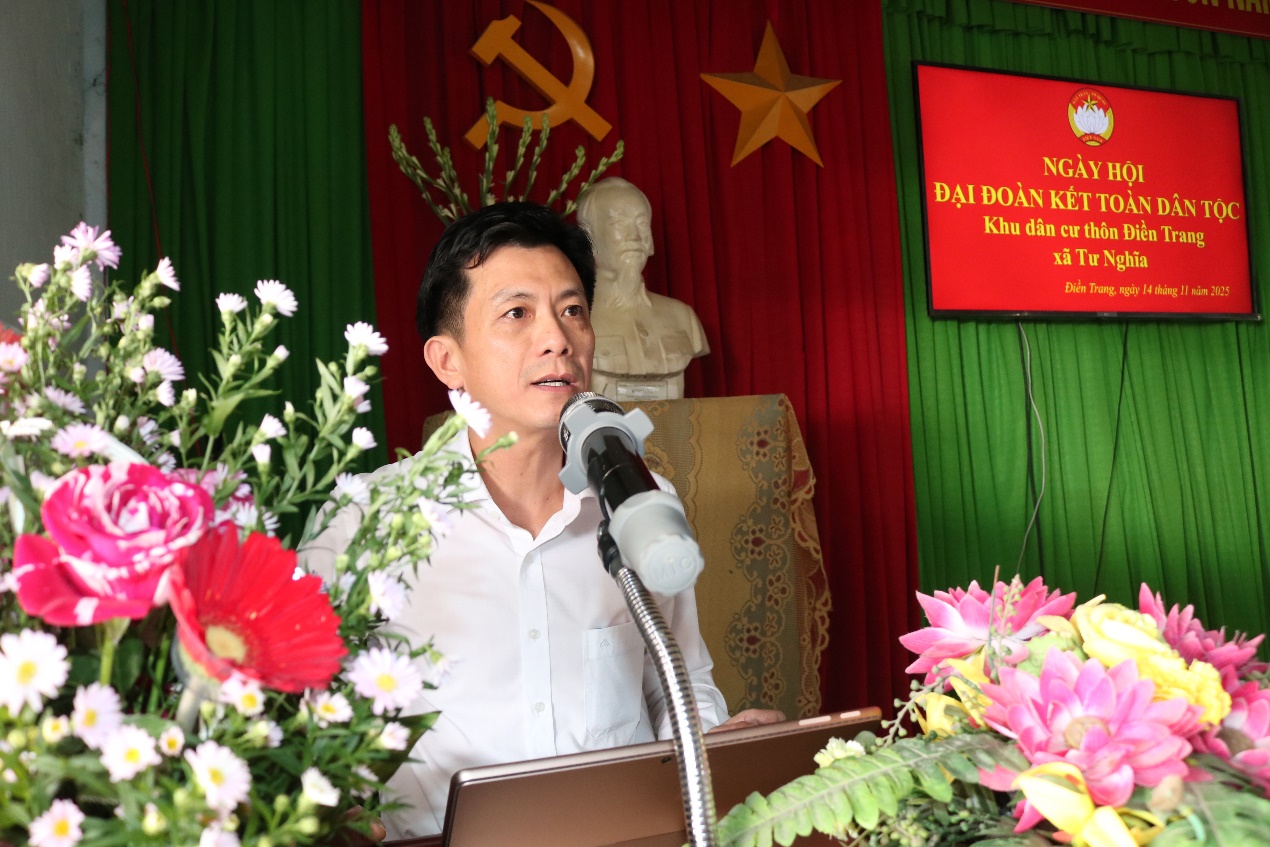 Phát biểu tại Ngày hội, đồng chí Nguyễn Ngọc Hưng - Phó Bí thư Đảng ủy, Chủ tịch UBND xã Tư Nghĩa đã biểu dương và chúc mừng bà con Nhân dân thôn Điền Trang đã đạt được những kết quả đáng khích lệ trong phát triển kinh tế, xây dựng đời sống văn hóa và giữ vững an ninh trật tự ở khu dân cư trong thời gian qua. Đồng chí Chủ tịch UBND xã mong muốn trong thời gian tới, người dân trong thôn Điền Trang tiếp tục phát huy tinh thần đoàn kết, tích cực lao động sản xuất, phát triển kinh tế bền vững, quan tâm gìn giữ bản sắc văn hóa dân tộc, xây dựng nếp sống văn minh; chú trọng chăm lo sức khỏe, nâng cao dân trí, góp phần thực hiện thắng lợi các mục tiêu phát triển kinh tế - xã hội trong giai đoạn mới.