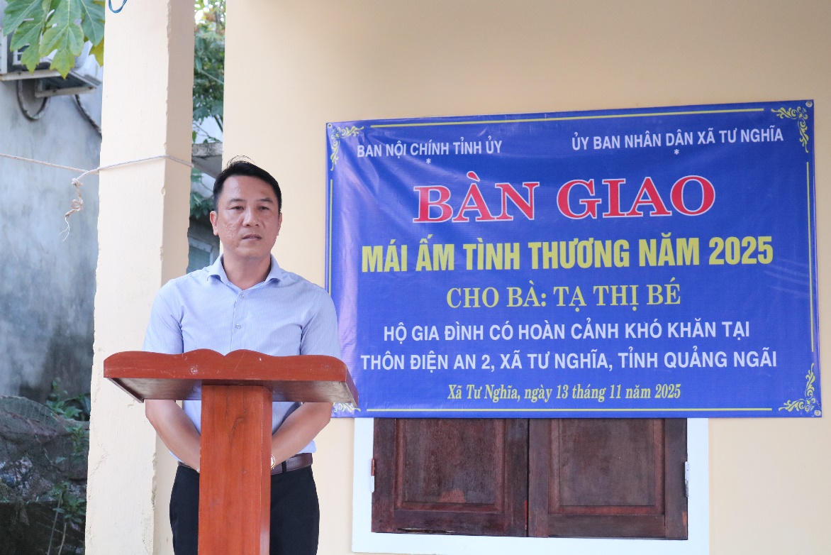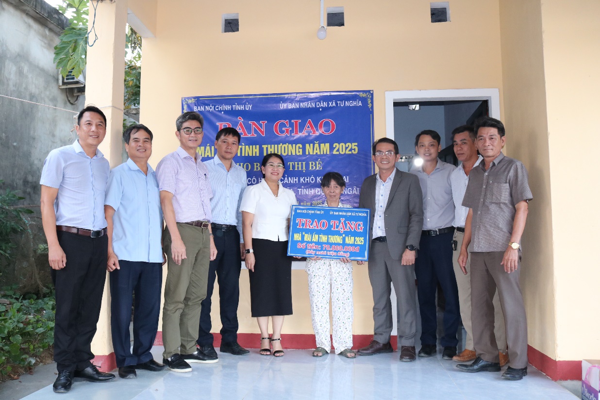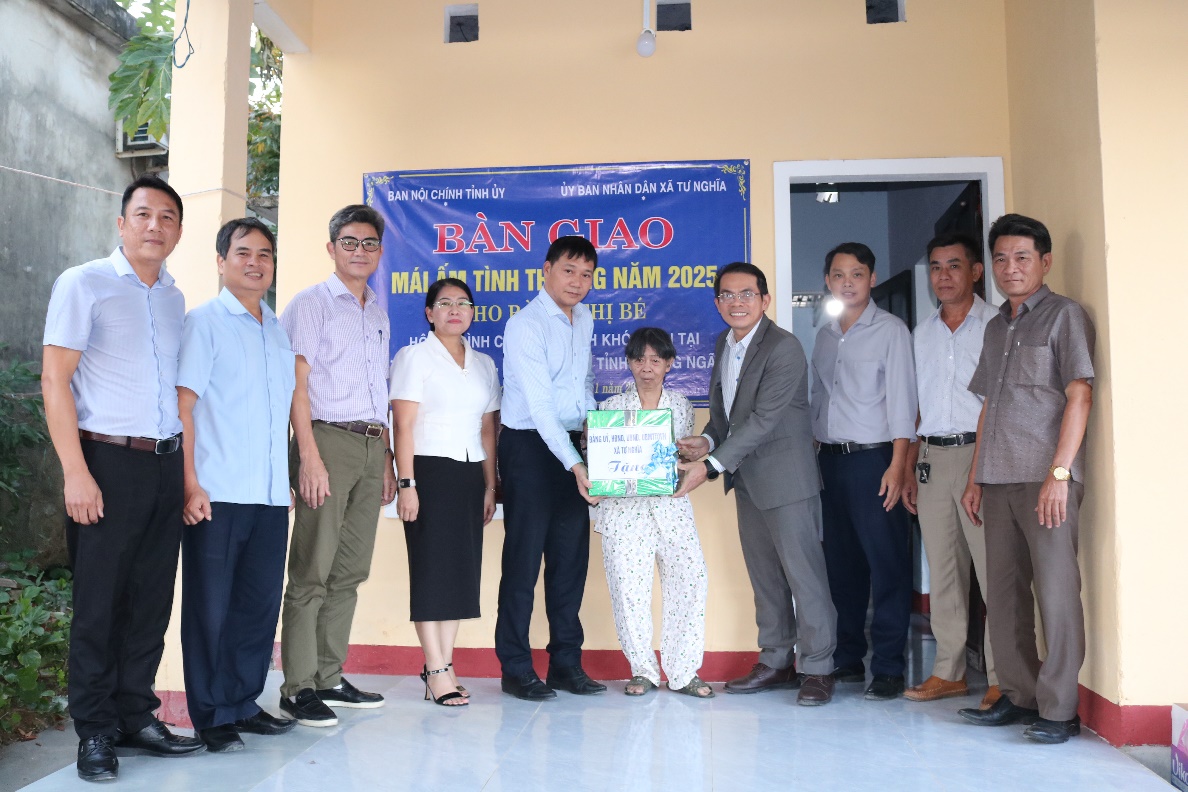 Chiều ngày 13/11/2025, Ban Nội chính Tỉnh ủy Quảng Ngãi phối hợp với UBND xã Tư Nghĩa tổ chức nghiệm thu và bàn giao nhà “ Mái ấm tình thương” cho bà Tạ Thị Bé, 71 tuổi, ở thôn Điện An 2, xã Tư Nghĩa.
