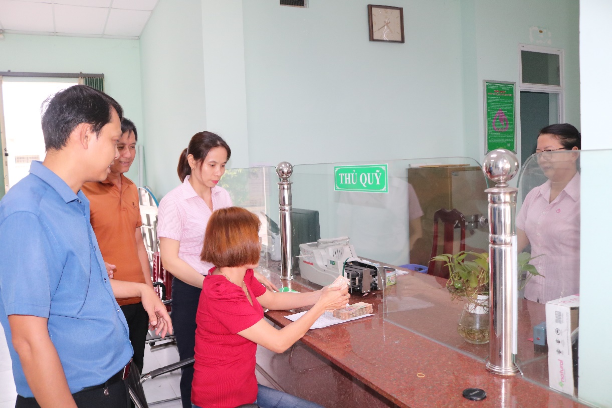 Khách hành vay vốn nhận tiền dưới sự chứng kiến của lãnh đạo Phòng Giao dịch Ngân hàng Chính sách xã hội Tư Nghĩa, Hội Nông dân xã và Tổ trưởng tổ vay vốn