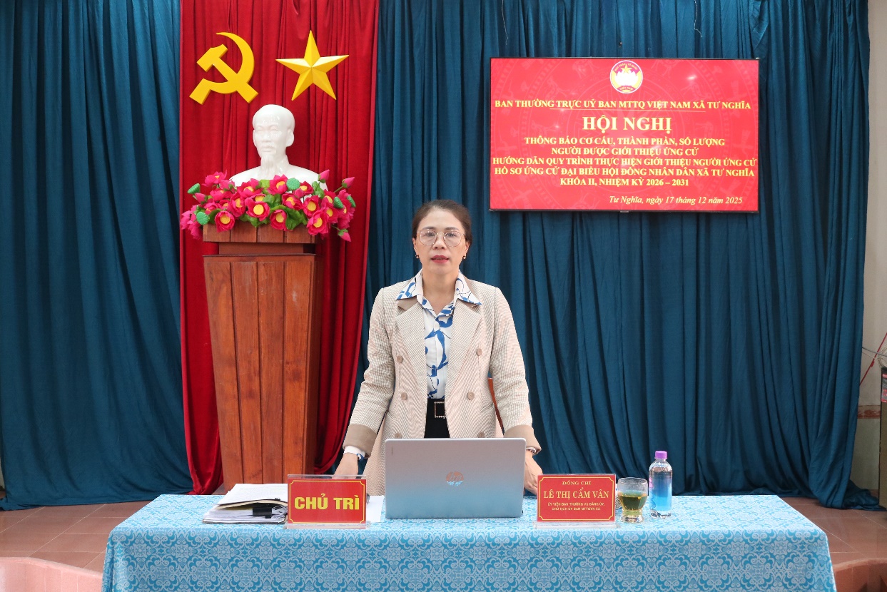 Chiều ngày 17/12/2025, Ủy ban MTTQVN xã Tư Nghĩa tổ chức hội nghị thông báo, cơ cấu, thành phần, số lượng người được giới thiệu ứng cử, hướng dẫn quy trình thực hiện giới thiệu người ứng cử, hồ sơ ứng cử đại biểu HĐND xã Tư Nghĩa khóa XII, nhiệm kỳ 2026 - 2031. Đồng chí Lê Thị Cẩm Vân - Ủy viên Ban Thường vụ Đảng ủy, Chủ tịch Ủy ban MTTQVN xã Tư Nghĩa chủ trì hội nghị.