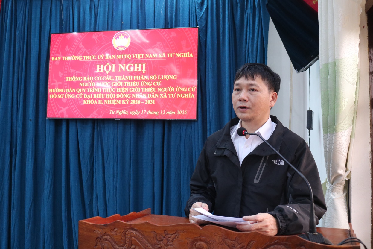 Phát biểu tại hội nghị, đồng chí Đỗ Ngọc Tây - Phó Bí thư Thường trực Đảng ủy xã Tư Nghĩa đề nghị các tổ chức, cơ quan, đơn vị phối hợp chặt chẽ với Ủy ban MTTQ Việt Nam xã triển khai thực hiện các bước bầu cử đúng quy định, bảo đảm lựa chọn, giới thiệu những người đủ tiêu chuẩn, uy tín, năng lực tham gia ứng cử đại biểu HĐND xã khóa II, nhiệm kỳ 2026 - 2031.