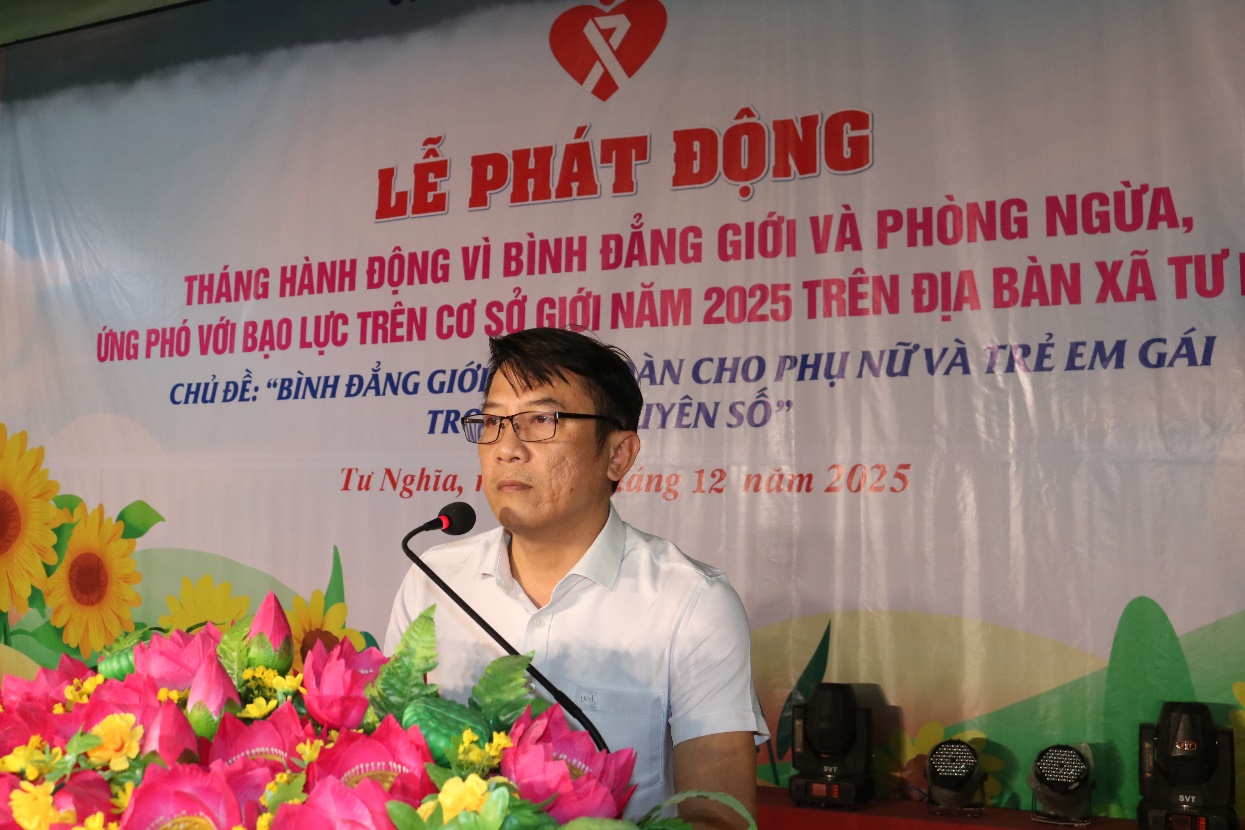 Phát biểu tại Lễ phát động, đồng chí Nguyễn Văn Quang - Phó Chủ tịch UBND xã Tư Nghĩa kêu gọi các cấp, các ngành, các tổ chức, cộng đồng và toàn thể Nhân dân cùng chung tay hành động vì một xã hội bình đẳng, an toàn và hạnh phúc cho phụ nữ và trẻ em gái trong kỷ nguyên số. Để Tháng hành động năm 2025 được triển khai hiệu quả, Phó Chủ tịch UBND xã Tư Nghĩa đề nghị các cấp ủy Đảng, chính quyền, các hội đoàn thể ở xã cần tăng cường quan tâm, lãnh đạo và tổ chức thực hiện công tác bình đẳng giới; đẩy mạnh tuyên truyền, phổ biến chủ trương của Đảng, chính sách pháp luật của Nhà nước về bình đẳng giới, phòng ngừa và ứng phó với bạo lực giới trên các phương tiện truyền thông, không gian mạng, cơ quan, trường học và cộng đồng dân cư. Kêu gọi toàn dân bằng các hành động thiết thực hãy lên tiếng phản đối mọi hình thức kỳ thị, xúc phạm, đe doạ phụ nữ và trẻ em gái trên môi trường mạng; không khoan nhượng với hành vi quấy rối, bạo lực đối với phụ nữ và trẻ em trong gia đình, ngoài đời sống xã hội và đặc biệt là trên không gian mạng.