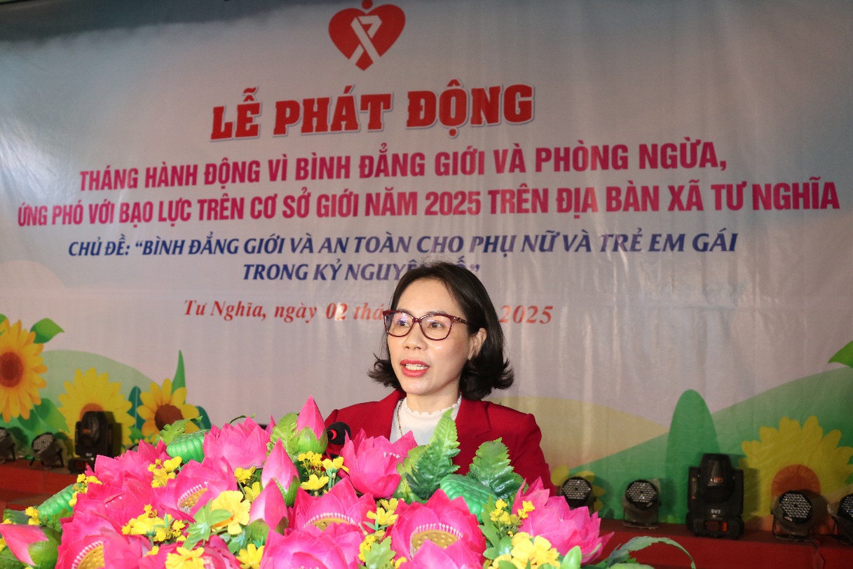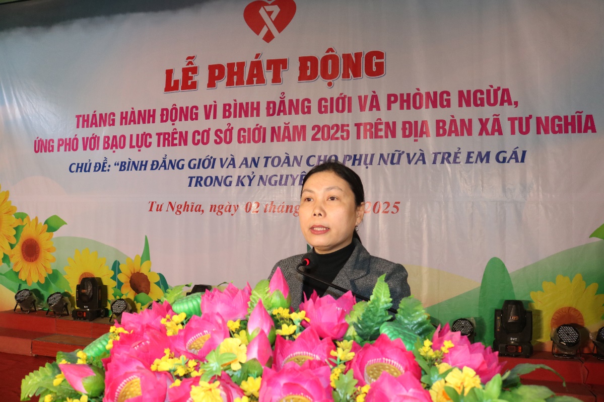 Tại Lễ phát động, đồng chí Đinh Thị Thu Hằng - Phó Chủ tịch Ủy ban MTTQVN xã, Chủ tịch Hội LHPN xã Tư Nghĩa phát biểu hưởng ứng “Tháng hành động vì bình đẳng giới và phòng ngừa, ứng phó với bạo lực trên cơ sở giới” năm 2025.