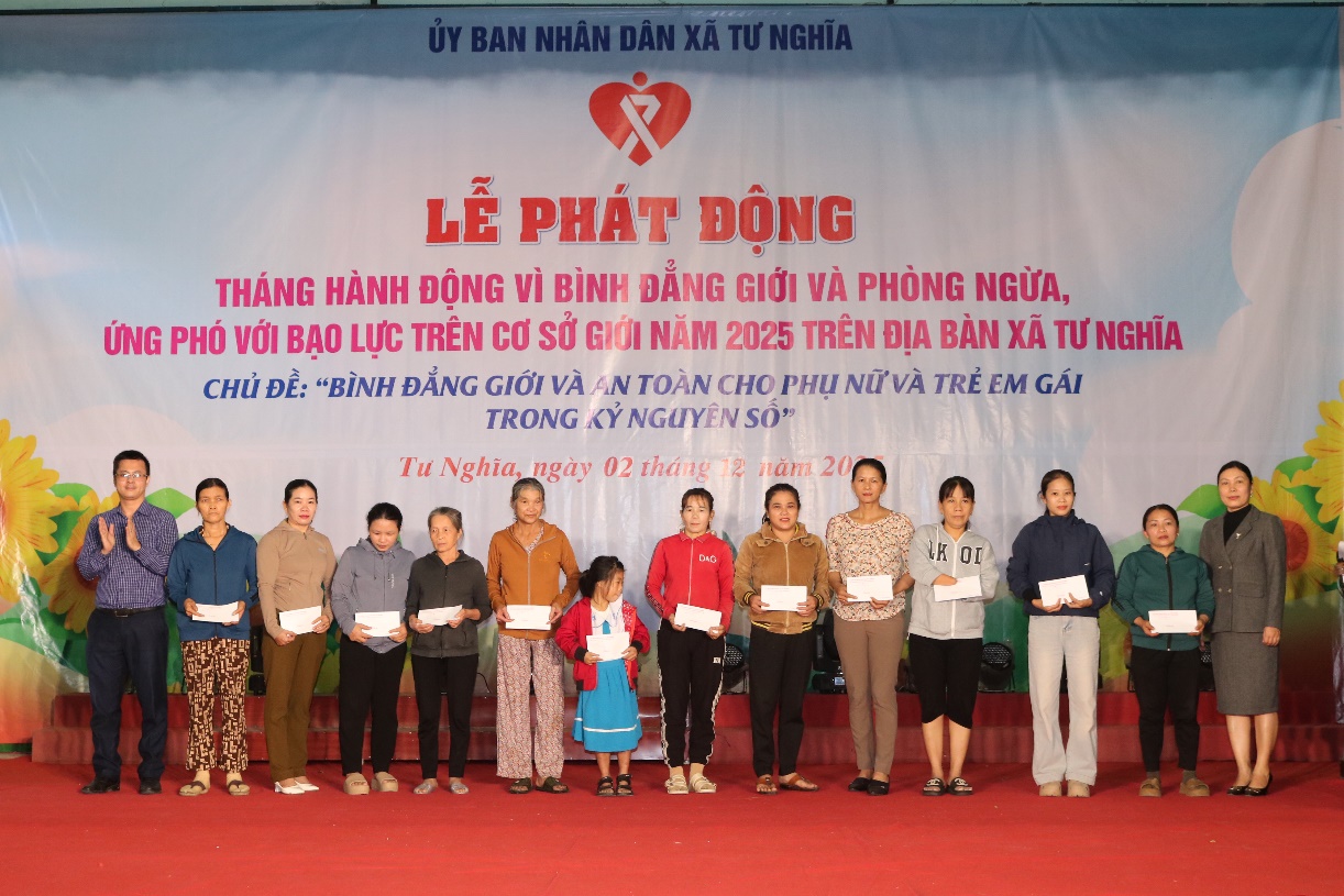 Dịp này, UBND xã Tư Nghĩa đã trao tặng 25 suất quà cho các chị em phụ nữ và trẻ em gái có hoàn cảnh khó khăn trên địa bàn xã, mỗi suất quà trị giá 500 nghìn đồng tiền mặt.